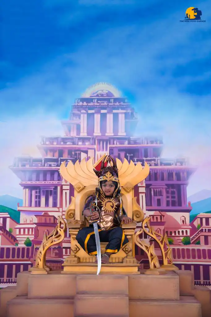 At Kidz Foto Garage, we are thrilled to offer a unique and exciting photo shoot experience with our Bahubali themed photo studio set up. Inspired by the grandeur and magnificence of the Bahubali movie, our studio in Hyderabad is designed to transport you to the world of kings and queens, warriors and battles, and breathtaking landscapes.